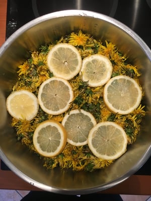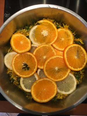 - Dans une bassine à confiture, mettre les fleurs de pissenlit, l'eau, les oranges et le citron.